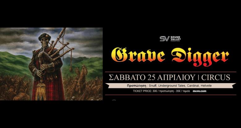 Grave Digger presents: " Tunes of War " 30th anniversary Σάββατο 25 Απριλίου Λάρισα / Circus Προπώληση εισιτηρίων: 1. Snuff 2. Underground tales 3. Cardinal 4. Helvete Οι Grave Digger έρχονται στη Λάρισα για να παίξουν ζωντανά ΟΛΟ το " Tunes of War " , εν όψει του εορτασμού των 30 χρόνων, από το έτος που κυκλοφόρησε. Καλά διαβάσατε..